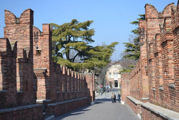 Я особенно ждала момента, когда во время прогулки увижу Кастельвеккьо. О нем у Вайля написано: «… выходишь к набережной Адидже и видишь — Кремль. Красный кирпич, ласточкины хвосты, монументальность и мощь… Это и есть Кастельвеккьо — замок с примыкающим мостом Скалигеров. При виде веронского Кремля охватывает даже некоторый трепет: как далеко протянулась рука Москвы. Хотя и знаешь, что все наоборот: Москва повторяла зады Италии. В Вероне это нагляднее всего».