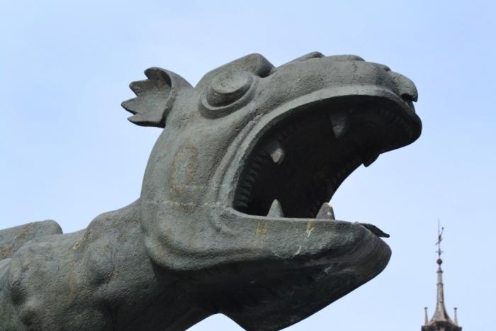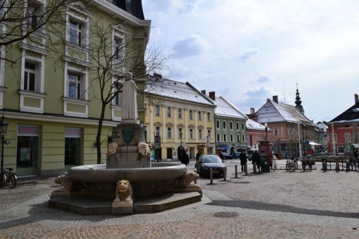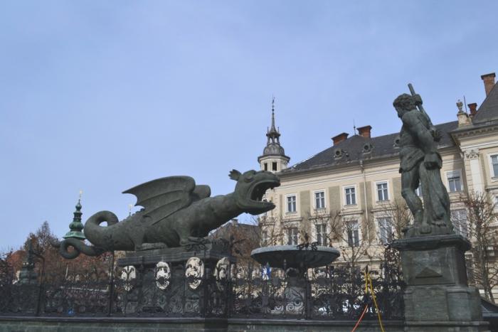 Как всегда в Австрии порадовало наличие удобной подземной парковки прямо в историческом центре. Мы вынырнули на Нойеплатц, напротив главной достопримечательности Клагенфурта – фонтана с драконом. Автор запечатлел напряженный момент схватки между чудищем и героем из местных, освободившим город от неприятного соседства.