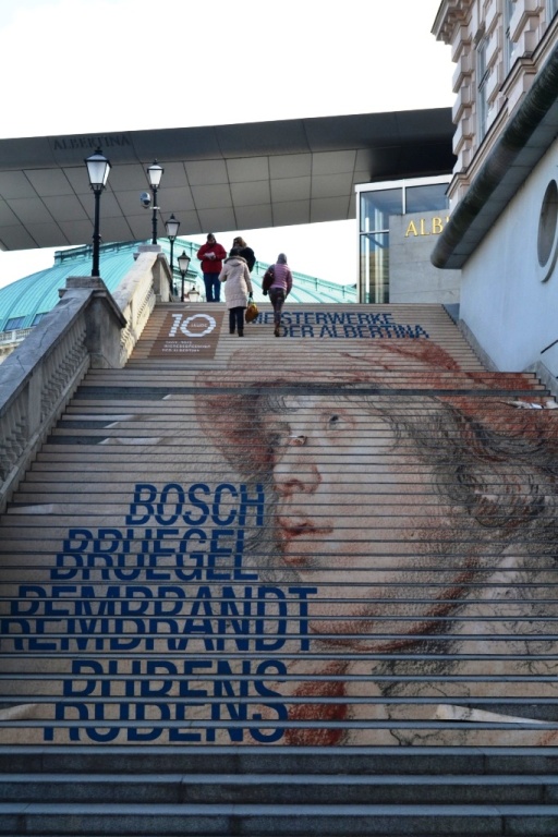 Посещать галерею Альбертина мы не планировали. Но буквально за два дня – 14 марта — здесь открылась потрясающая выставка с нашими любимыми голландцами и фламандцами. Пройти мимо рисунков Рубенса, Рембрандта, Босха и Брейгеля-старшего было невозможно! Тем более при виде такой лестницы в музей: