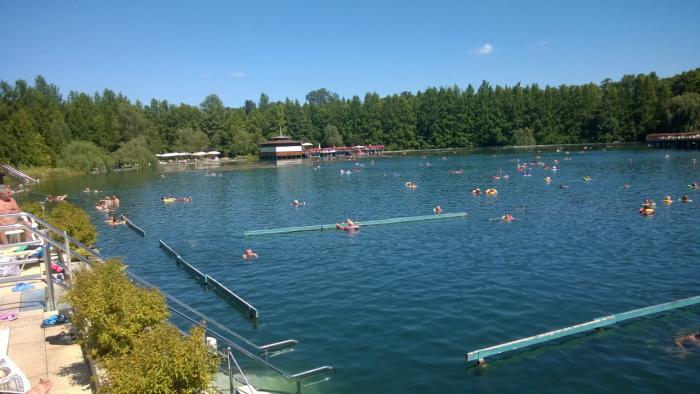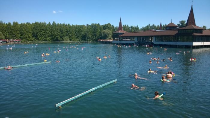 На следующее утро, нацепив на шею надувные «сосиски», любезно предоставленные нам Владиславом вместо велосипедов:), мы подошли к кассам лечебного озера. Был взят билет Relax (на четыре часа) за 4000 форинтов на каждого, по которому помимо озера можно посещать различные сауны и джакузи. Не прогадали. Далее немного фото озера и нашего «релакса»: