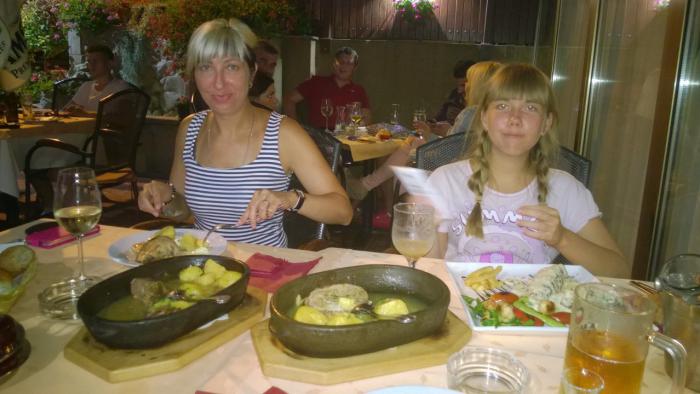 Приятно, чёрт возьми, в другой стране увидеть своего президента, и не в образе гея, как мы не однократно встречали в Вене, а как положено, «портретно». Надо обладать определённой смелостью, ведь некоторых гостей из некоторых стран это может не порадовать — а это потеря клиентов и денег. Видимо деньги не главное. Далее был ужин в ресторане. Это что-то. Чорба подавалась как надо, в большой керамической кастрюле. Когда официант (а нас, как «дорогих гостей», обслуживал сын хозяина) разливал это по тарелкам, нужно было сказать «доста» (хватит). Баранина в чугунках и куриные рулетики (у Юли) были просто объеденье.