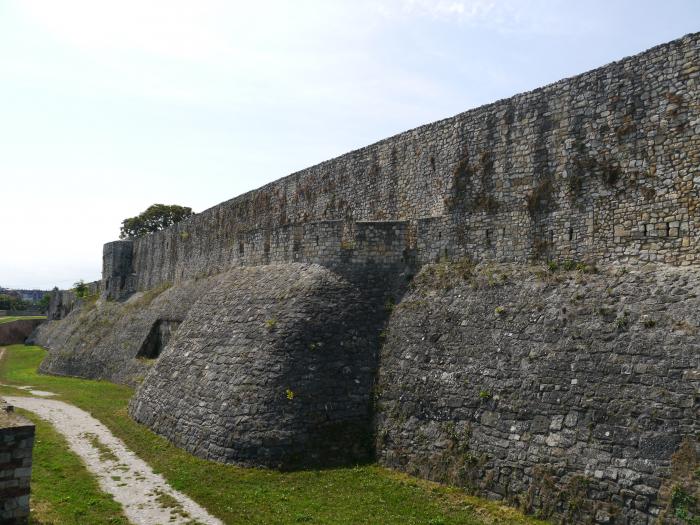 Поднимаясь выше уже вблизи видим неприступные стены укреплённые мощными контрфорсами.
