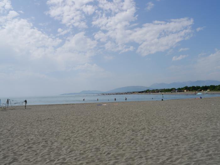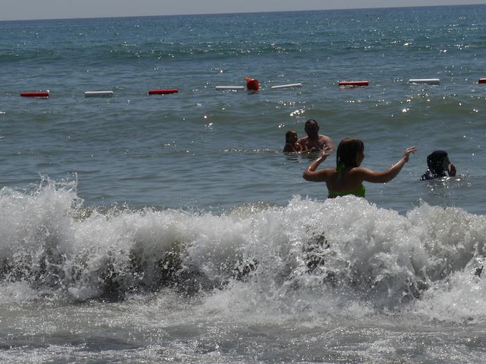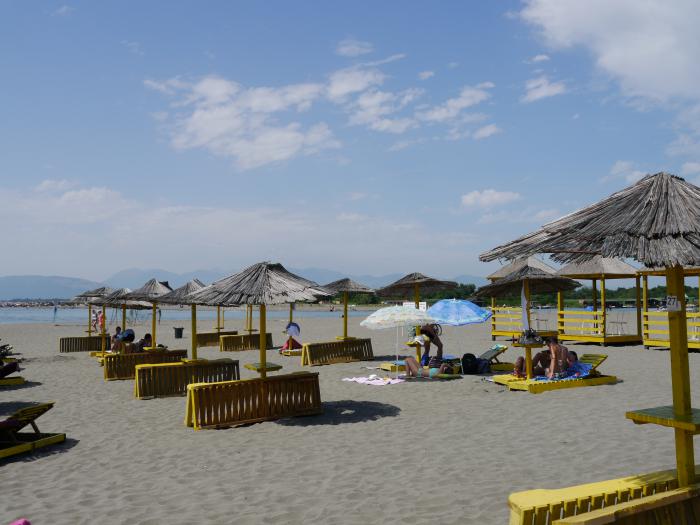 Один грибок с двумя лежаками стоил 5 эвро (по-моему нормально, но можно и бесплатно, на своих топчанах, и при этом пользоваться всей инфраструктурой). Т.к. это открытое море, всегда присутствовал ветер разной степени тяжести, и соответственно волны. Но нас это только радовало.