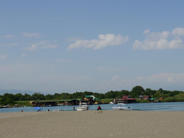 Это река, на противоположном берегу видны небольшие рыбные ресторанчики. Скушать рыбку в планах было, но мы так нажарились на пляже, что не было аппетита, и решено было сгонять быстренько на Скадарское озеро. От острова до небольшого пляжика на озере, координаты