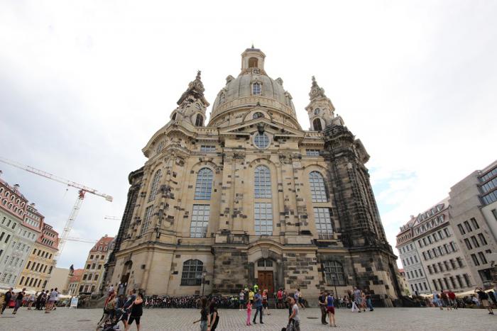 Уже в 11 веке, еще до существования Дрездена, на этом месте уже стояла церковь «Kirche zu Unserer Lieben Frauen», посвященная пресвятой Богородице. Со временем длинное официальное название сократилось до одного слова — Фрауэнкирхе. Первоначальное здание церкви простояло до 18 века. Когда стало понятно, что разрушения ветхого здания уже не предотвратить то в 1728 году старое здание церкви было снесено. А на этом месте архитектор Георг Бэр построил необычную церковь. Начиная с того, что форма фундамента не была в традиционном трехнефном стиле в виде креста, а имела форму правильного восьмиугольника. С семи сторон расположены входные двери, восьмая часть посвящена алтарю. Архитектор сознательно отказался от проектировки главного входа. Согласно постулатам евангелической церкви, как все люди равны перед Богом, так и входы в храм должны быть равноценными.