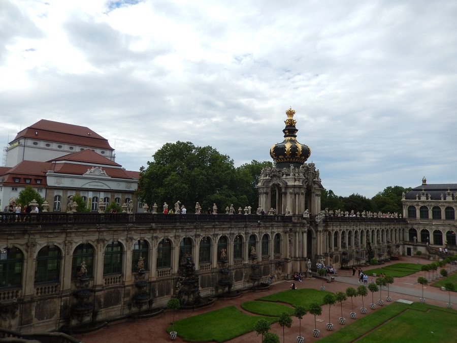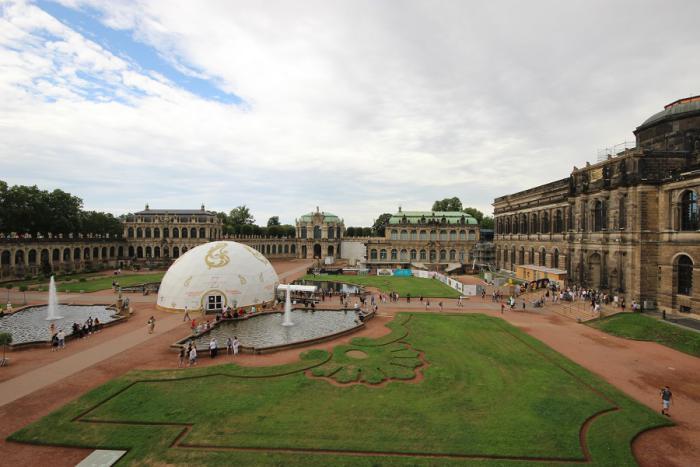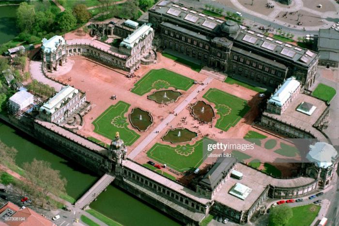 Напротив замка-резиденции, через дорогу, находится знаменитый дворцово-парковый комплекс Цвингер (Zwinger). Это фото с просторов интернета, ибо вид сверху лучше показывает масштаб постройки. Наши фотоаппараты не смогли всё охватить…
