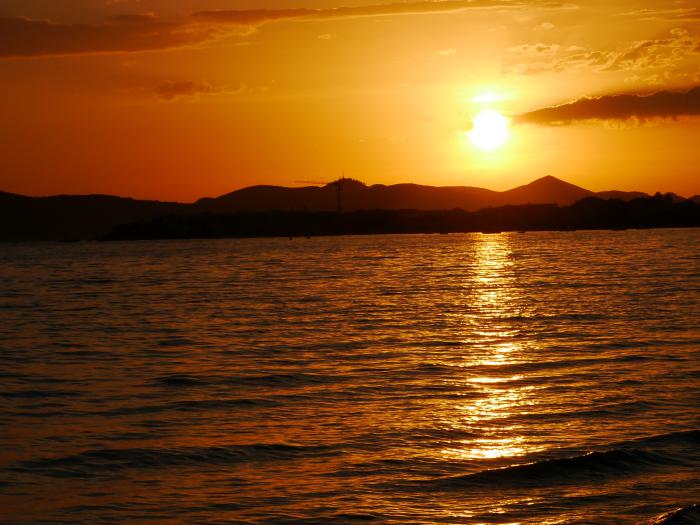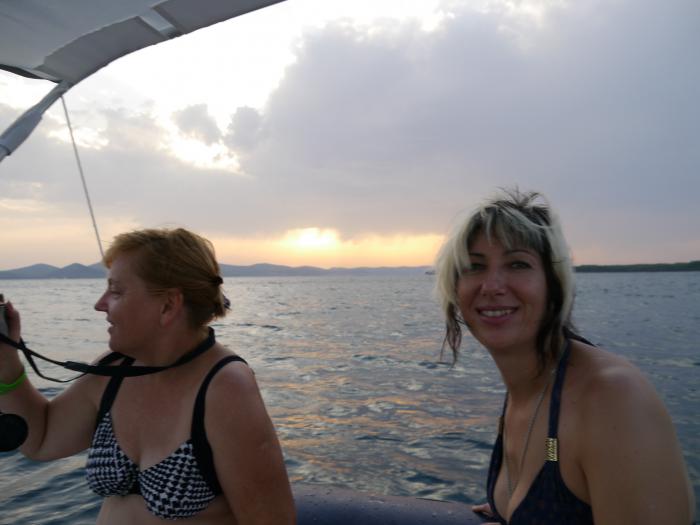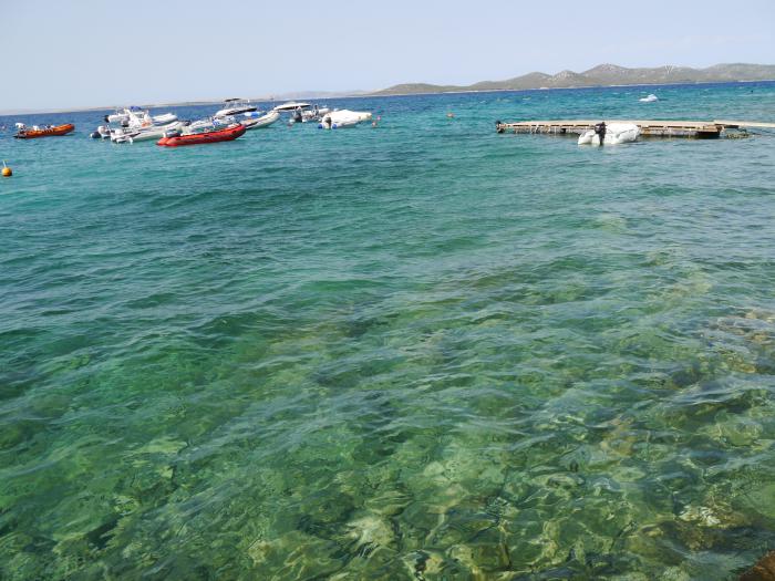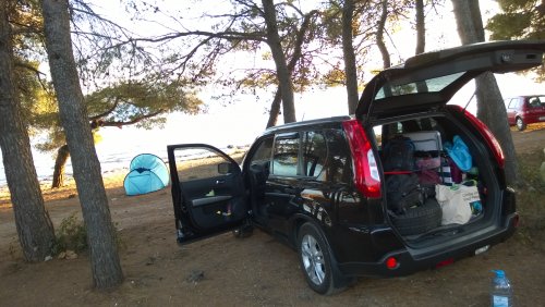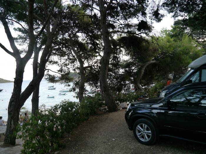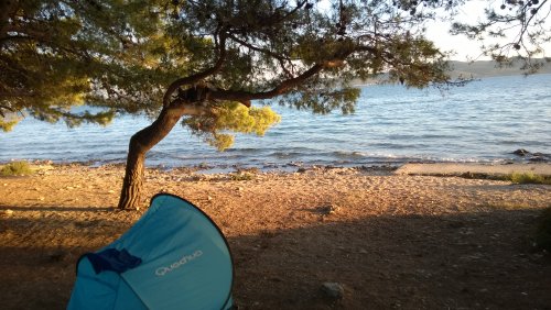 В середине дня Иван и Бранка собрались, мы вместе пообедали и попрощались до следующего года. Паром отчаливал только в 8.00 следующего дня, а до этого времени необходимо было найти порт и место для ночёвки. Дорога в Задар шла по побережью с красивыми видами. Кое-где на диких пляжах, в соснах, стояли палатки, повсюду были баки для мусора и биотуалеты. Неожиданно у меня появилась идея переночевать в палатке на одном из многочисленных пляжей. Робко делюсь идеей с Ольгой (а она совсем не турист, романтики с ползающим по щеке муравьём не понимает) и, о чудо, жена соглашается. С приключениями находим в Задаре порт отправления (оказывается, нужен был не центральный, а Luka Gazenica), а на обратном пути увидели отличный вариант для ночёвки. Рядом море, сосны, такие-же как мы дикари, но всё на расстоянии, никто друг-дружке не мешает.