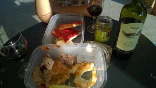 Дело к вечеру, в ближайшем магазине купили маринованных в вине королевских креветок, другой снеди, а у Федерико (хозяин апартаментов) нашлось отличное Санджовезе собственного приготовления. Все виноградники вокруг отеля — его.