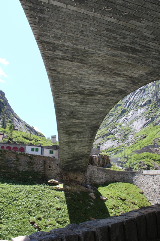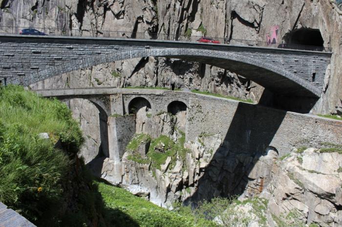 Не забывая цели поездки, следуем к перевалу Сен-Готард и «Чертову мосту» (координаты 46.647341; 8.590823). Для меня это было самое незабываемое место за весь маршрут. Немногие знают, что место с мемориалом является территорией России: