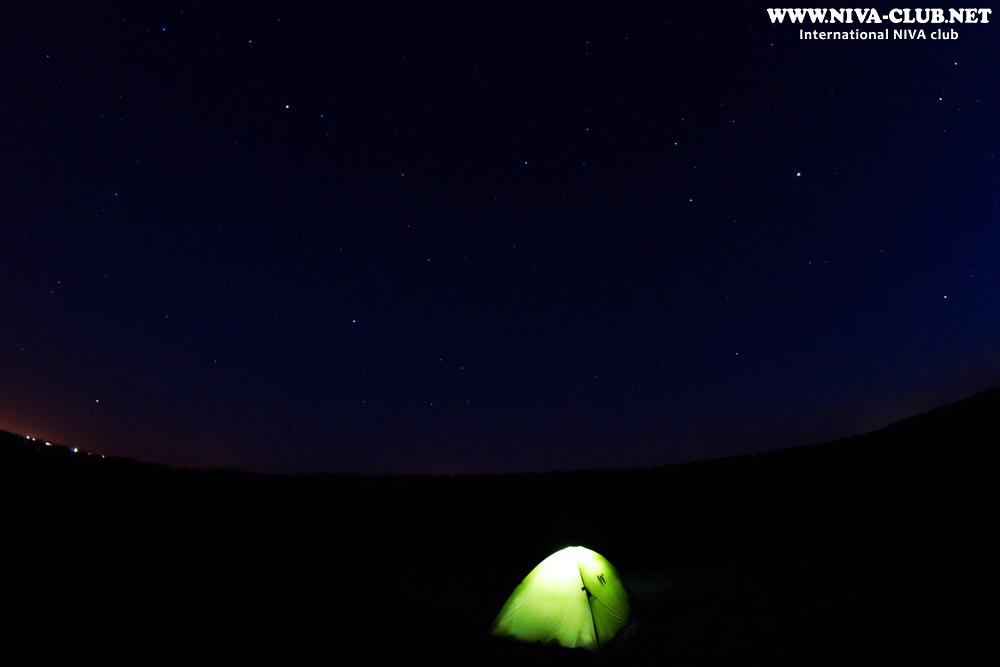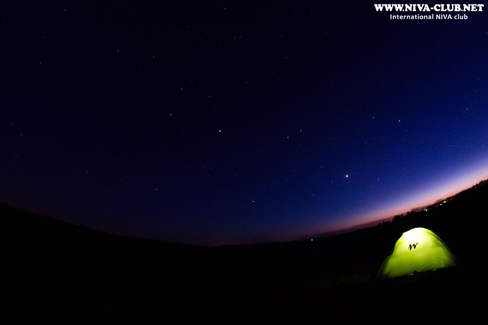 мы поспешили к нам на присмотренный хребет, небо чистое, поставили только палатку, а на утесе, куда прежде загнали Еву, собрали ужин и поставили примус греть нам чай и сели любоваться закатом. А потом звездным небом, спустившимся на реку туманом. Тут нам опять невероятно повезло, в который раз. Поздний восход луны, сколько оказывается у нас крадет звезд ночное светило, просто невероятно, на безлунном небе количество звезд становится бесконечным,
