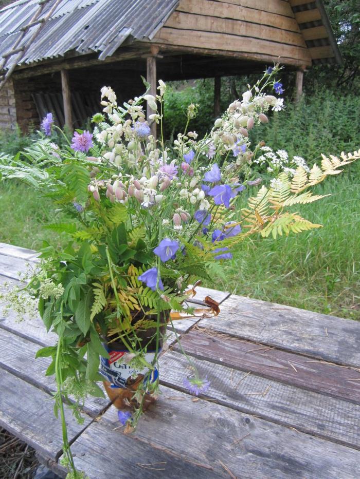На берегу озера мы и обосновались… народу рядом никого, ближайшая деревня в получасе ходьбы пешком…идиллия! И началась дикая и в тоже время прекрасная житуха: дров- полный лес (хотя газовая горелка оказалась незаменима), земляники и клубники – целые поляны (и кастрюли)))), цветов — целые вазы.