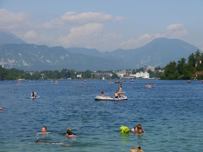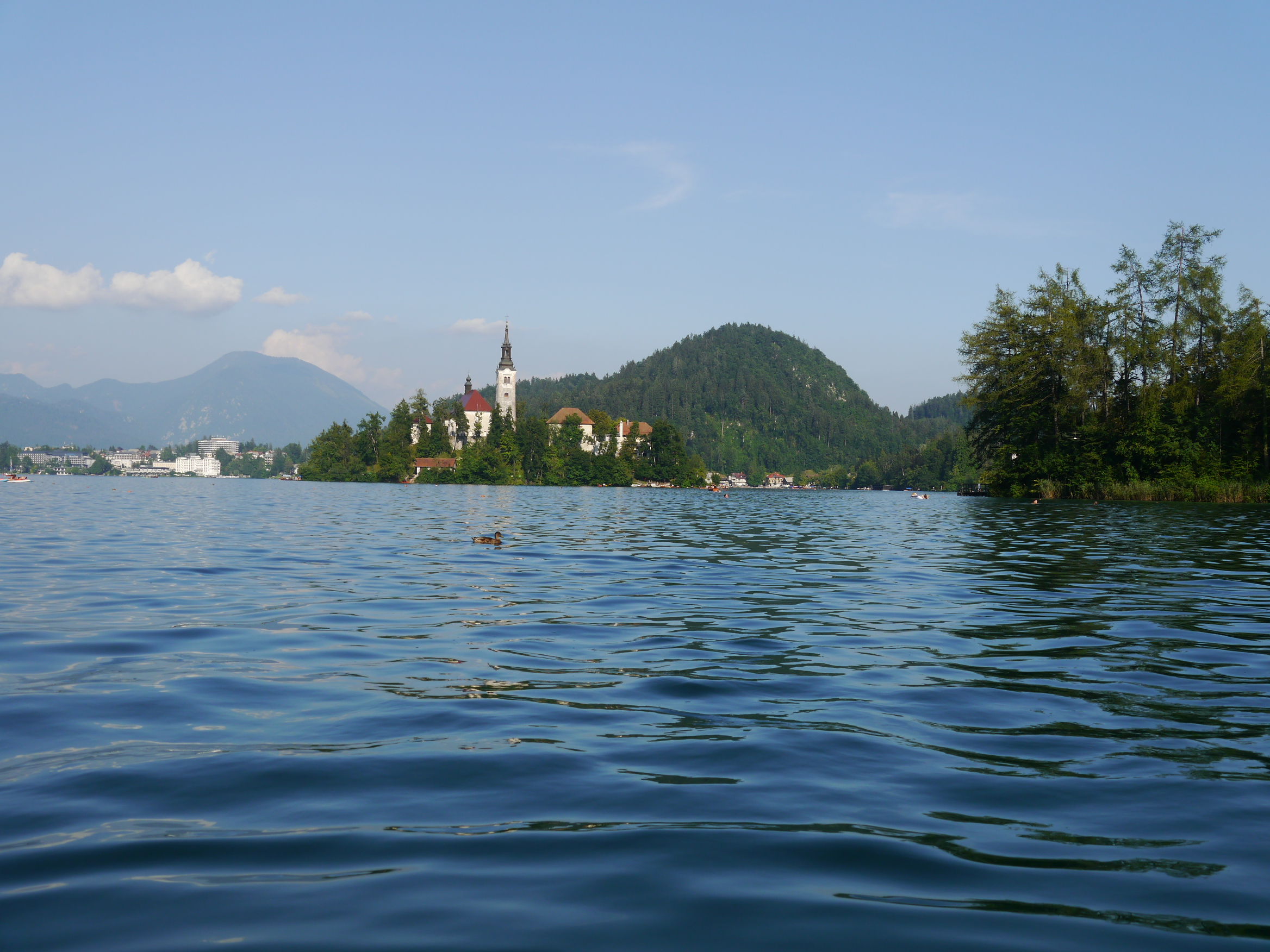 Заплатив за стоянку в паркомате, мы скоренько поехали в городок Блед, к одноимённым озеру и замку. Расстояние не очень большое, примерно сто км., но надо учитывать время возвращения в Порторож. Добрались достаточно быстро, примерно полтора часа и стали искать стоянку для авто, что было не просто. Со стороны города все стояночные места были забиты отдыхающими — пик сезона. Тогда я решил ехать по дороге вокруг озера, в надежде найти пляж с паркингом. И такое место нашлось! Прекрасный пляж на противоположной стороне от Бледа с платной парковкой (кажется 4 эвро). Можно было поискать и бесплатную парковку, но время уже поджимало. Итак, мы на месте. Об озере и замке я уже читал много очётов, смотрел много фото, место медийное и очень раскрученное. Но всё равно не удержусь и выставлю свои фото, возможно очень похожие на просмотренные мной у других авторов. Это место стоит того. Прекрасное, чистейшее озеро в окружении Альп с островом и храмом в самом его центре. Слева (или справа, смотря откуда смотреть) на скале — неприступный замок, бывший даже в прошлом резиденцией Тито. Недалеко расположено горное плато Поклюка, где проводятся этапы биатлонного кубка мира. В общем, красота!!! Вот несколько фото: