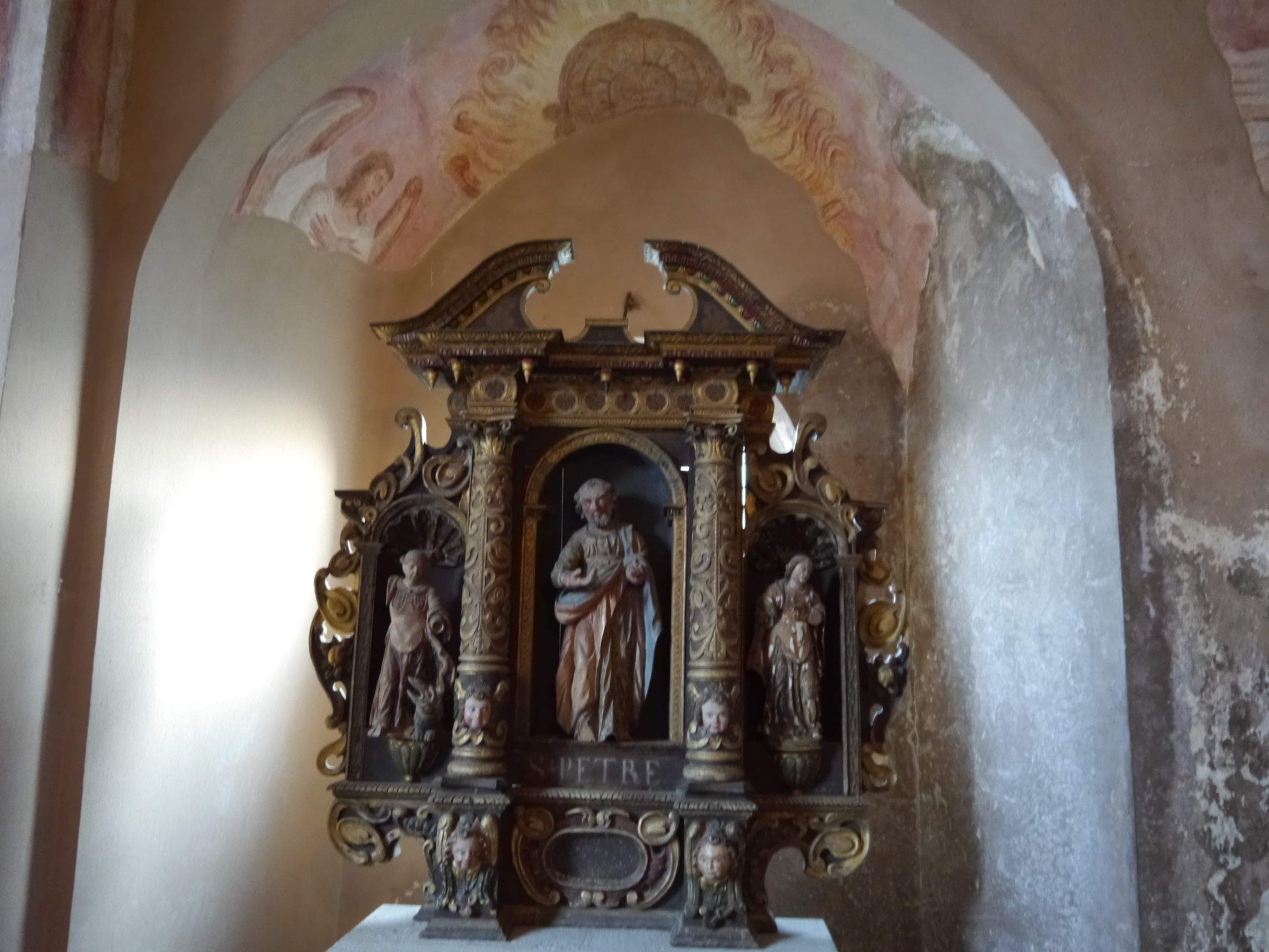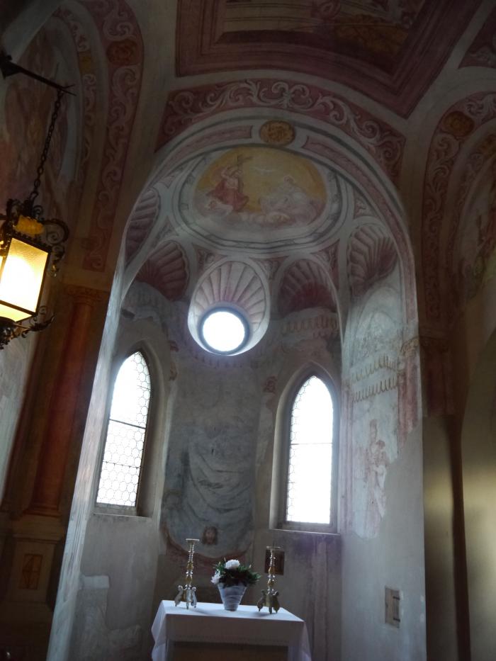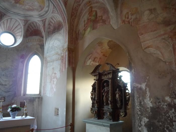 Метров за двадцать до берега я не удержался и плюхнулся в озеро, что вызвало бурное негодование жены (она не могла орудовать вёслами), поэтому мне пришлось из воды толкать лодку к берегу т.к. обратно забраться в неё было невозможно. Припарковав «бот», пошли рассматривать церковь. Первые следы священных сооружений оставила романская часовня, построенная еще при епископах Бриксена. Она не сохранилась. Затем, веке в XII, была построена базилика, от которой также остался только фундамент. Ее сменила готическая постройка: церковь с высокой колокольней (до 52 м). У нее была готическая арка над входом. Затем было построено здание храма в стиле барокко, открытое и ныне.