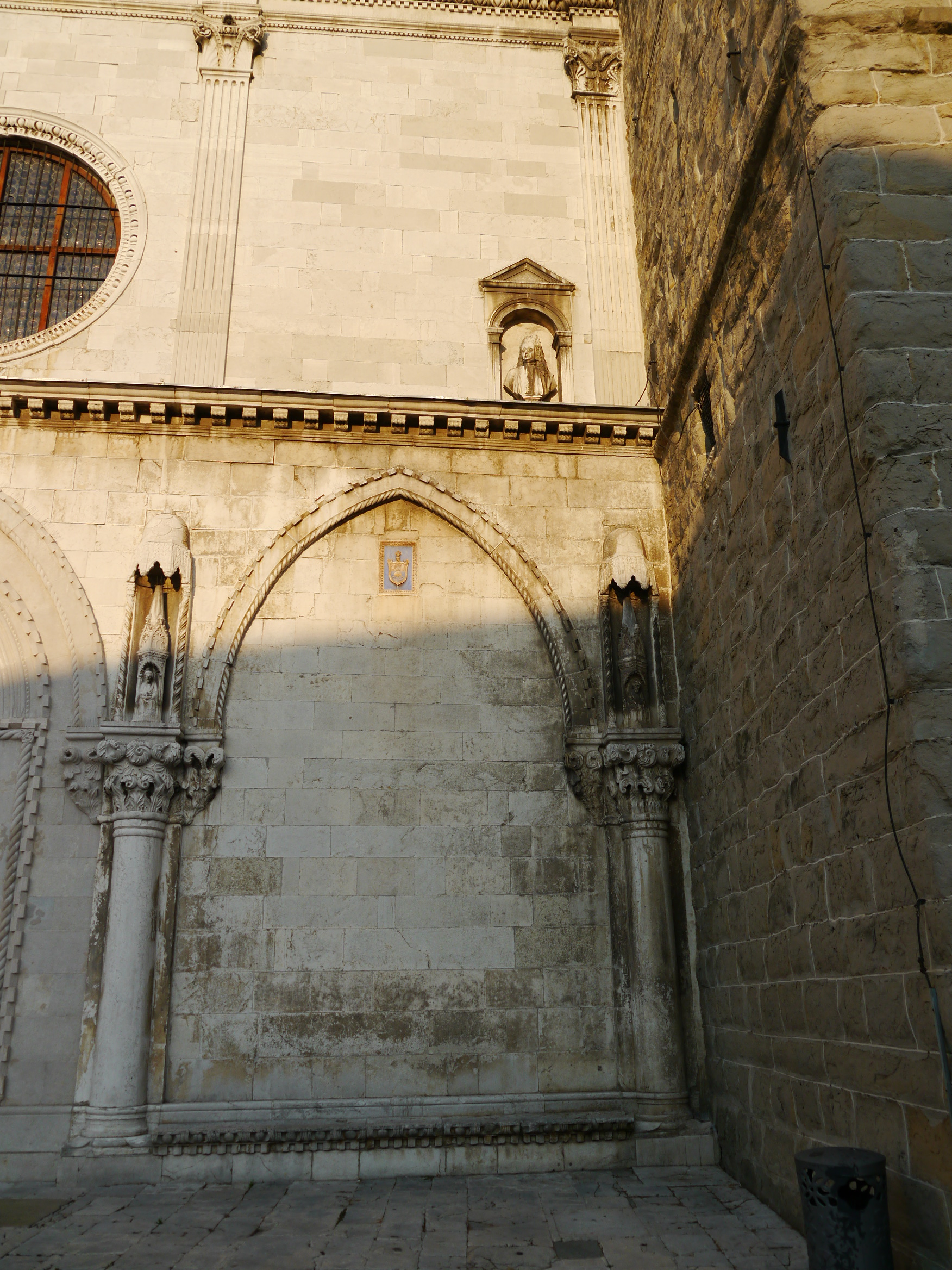 Преторийский дворец. Построен в стиле венецианской готики в 1464 году. Между двумя крыльями расположен белоснежный фасад с лестницей и балконом. В 17 веке над центральным фасадом надстроены элементы «ласточкин хвост» (как в московском кремле) и статуя Справедливости с мечом.