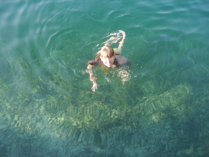 Вода прозрачная. Дно как на ладони, а глубина не менее двух метров (меня «скрывает», рост 1,88).
