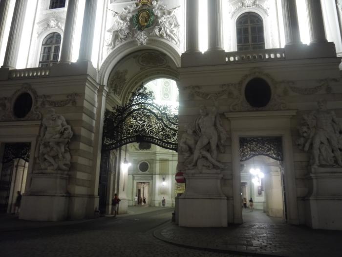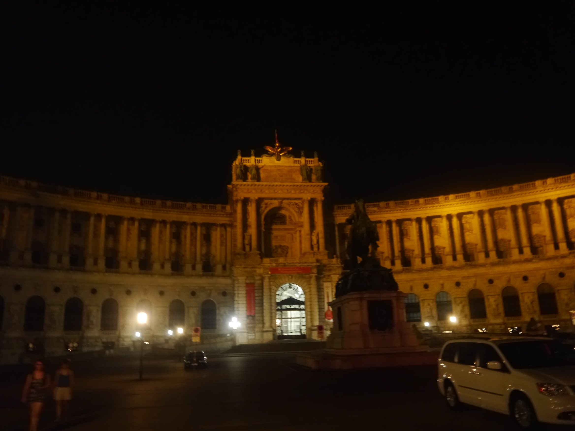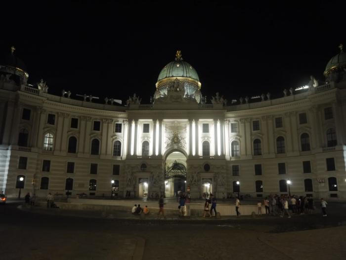 Полтора часа пролетели быстро, уже стемнело, а нам просто необходимо осмотреть ещё хотя-бы одну достопримечательность. Понятно, Шёнбрунн выпадает, он от нас далеко, но Хофбург рядом! Хофбург — грандиозный архитектурный ансамбль, объединяющий различные достопримечательности Вены — 18 строений и 19 дворцов, построенных в разное время и выдержанных в различных архитектурных стилях, поэтому всё охватить мы не смогли, но немного «приобщились».