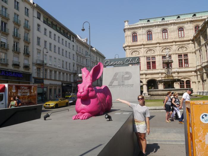 Розовый пасхальный кролик встречает посетителей выставки Альбрехта Дюрера в Венском музее Альбертина.