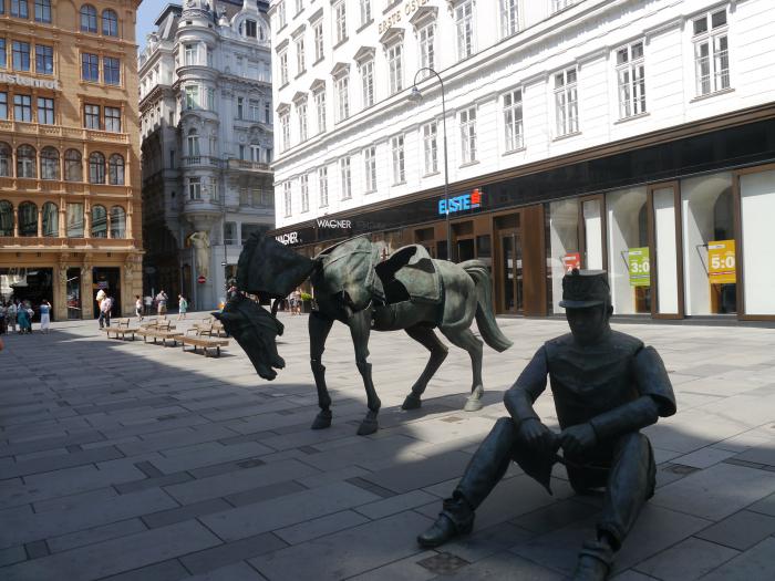 Сидящий на земле наездник и его верный конь на улице Грабен.