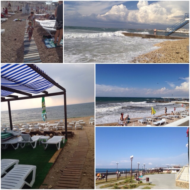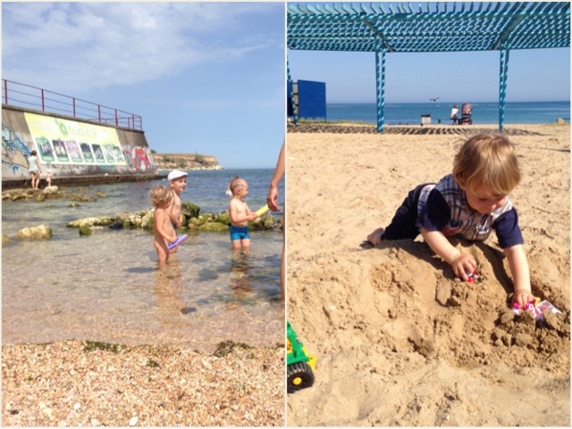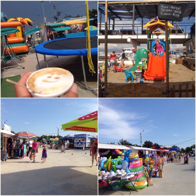 Это наш любимый пляж на данный момент. Я уже рассказывала про него в прошлой части рассказа. Немного повторюсь, сказав, что с детьми там оптимальный вариант отдыха: и детская площадка есть, и песка много, и на входе в море мелкая галька, абсолютно комфортная. Сейчас понавезли всяких развлечений детских, еды (чебуреки, блины, восточные сладости, кукуруза вареная, мороженое, поп-корн, вата сахарная и пр.), еще и бабушки ходят по пляжу предлагают то ягоды то рыбу какую-то, и массажный кабинет даже сделали (массаж спины 250р толи 20 толи 30 минут). А так цены — как в парке победы.