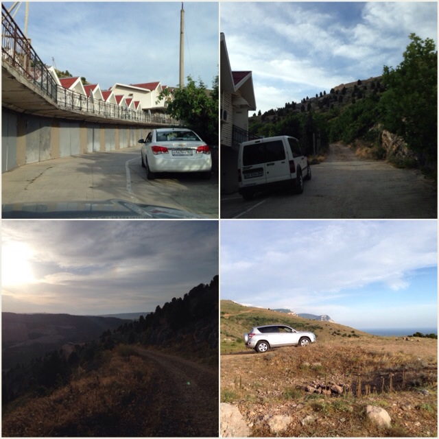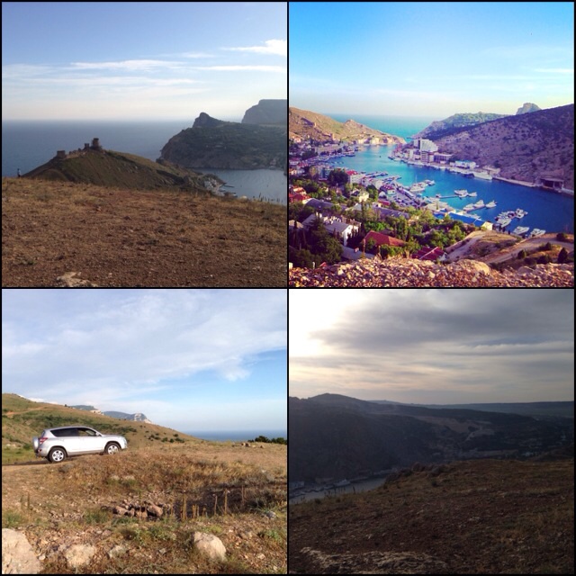 Сердце замирает. Но не только от высоты и красоты. Смотрите, какая огромная воронка перед машиной. Вторая мировая оставила свои страшные следы в этом прекрасном месте. Читала, что наши солдаты поставили в крепости пулемет и очень долго и успешно отстреливались от фашистов. Да еще и плакат повесили к ним обращенный, что-то вроде «Смерть фашистской гадине») но когда этот форпост был захвачен, то немцы использовали высоту против мирного населения, скатывали на них всякую дрянь с гор в бухту… Вообще тут много чего тогда происходило… Если соберетесь в Балаклаву — почитайте обязательно в интернете. Без героических подвигов наших солдат, партизан, мирных жителей — не ходили бы мы сейчас по этой земле… Спасибо им!