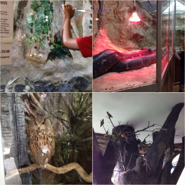 Расположен на Историческом бульваре. Не смотря на то, что здание небольшое, животных там много. Кролики с крольчатами. Цыплятки. Разрешили всех погладить) попугайчики просто так летают. Есть и большие птицы в клетках. Много всяких змеек и паучков. В рекламе упоминалось про шоу «кормление крокодилов». Оказывается каждому посетителю дают кусочек мяса на длинной палке и предлагают опустить в аквариум к крокодилам, чтоб они схватили. Ребенку интересно было) можно подразнить крокодильчиков — они очень агрессивно прыгают за мясом)