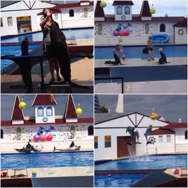 Дельфинариум. Это был наш первый Дельфинариум, так что сравнить особо не с чем) представление понравилось, шло час. Ведущая очень обаятельная, интересно озвучивает Шоу) дрессировщики — они вообще молодцы) даже не представляю, как можно дельфинов и морских котиков обучить всем этим трюкам) старший с интересом смотрел, мелкий — порывался убежать… По этой причине каких-то очень уж прям классных фоток у нас не получилось;)