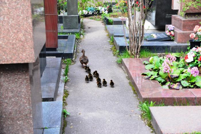 Но даже если видеть во всем этом культурологический феномен, все равно очень быстро наступает желание покинуть это место. Уже «под занавес» мы увидели совершенно необыкновенную и очень жизнеутверждающую картину, практически гимн новой жизни: между могильных плит утка-мама вела свое многочисленное потомство к кладбищенской стене и дальше – к монастырским прудам!