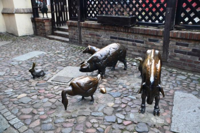 Обратно по дороге к Рыночной площади мы находим место под названием Старые Ятки. На протяжении семи веков здесь располагались мясные ряды, сейчас здесь – нечто вроде монмартра местного разлива. О прежнем назначении этого района красноречиво свидетельствует группа животных, олицетворяющих ассортимент продукции в прошлом.