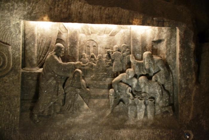 Стены часовни украшены скульптурными композициями, как оригинальными, так и интерпретациями известных произведений искусства. Например, «Тайной вечери» Да Винчи. Экскурсоводы любят задавать вопрос о глубине соляного барельефа. Чувствуя подвох, отвечаешь: ну, сантиметров пятьдесят. Оказывается, небывалый объемный эффект вызывает освещение изображения всего лишь в несколько сантиметров глубиной!