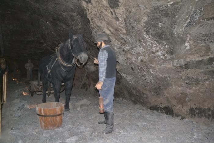 В XVII в. в велицких копях было почти сто лошадей. Они работали на шахте с XVI в. В штреке «Селец» можно увидеть, как использовались в шахтерском труде лошади. Они перевозили соль по штрекам или работали в упряжке манежного привода подъемных машин. Лошади-шахтеры, попав на поверхность, не умели щипать траву.