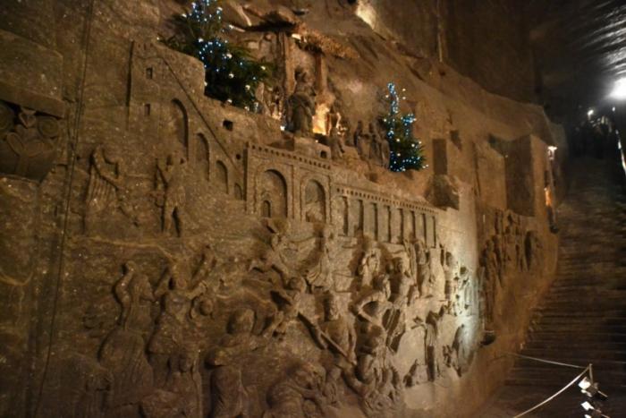 Многочисленные камеры соляной шахты украшают творения из соляных глыб. Одна из таких композиций – «Великая легенда» — повествует о легенде возникновения соляных залежей под Краковом.