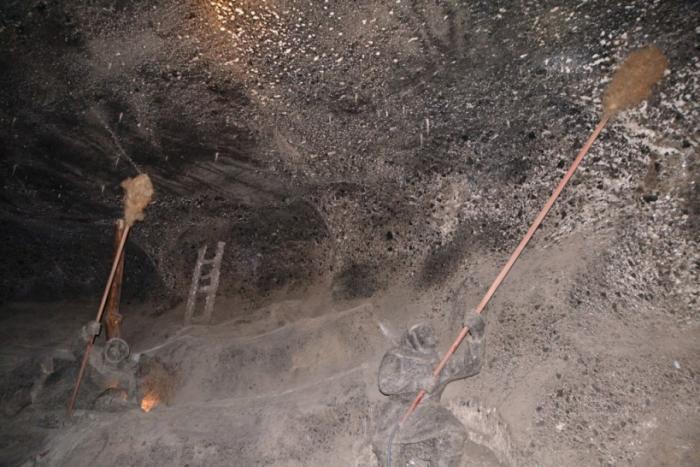 Деревянные желоба служили для сбора просачивающихся подземных вод в деревянные бочки, которые затем также поднимались на-гора.