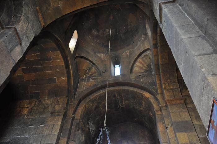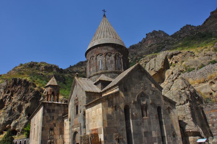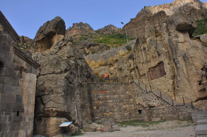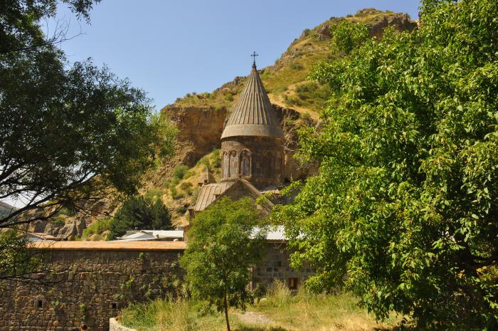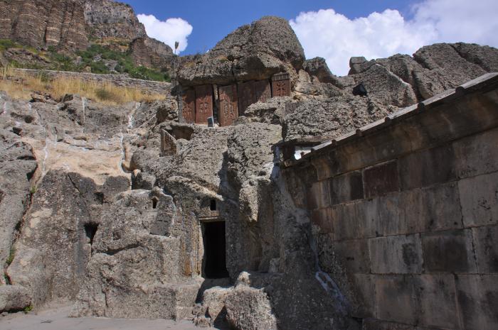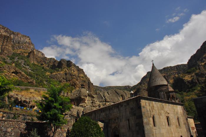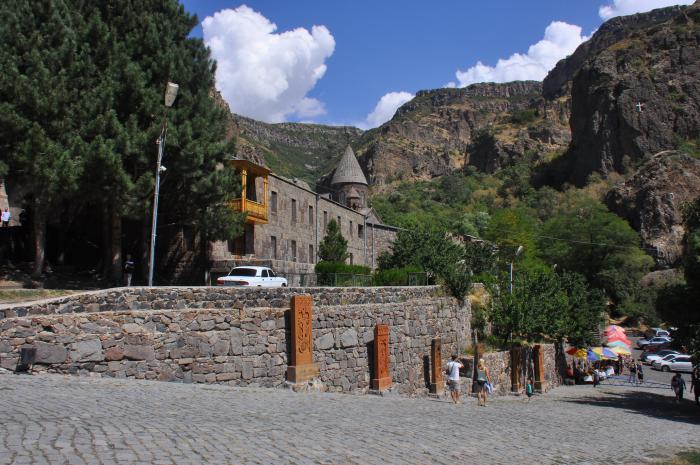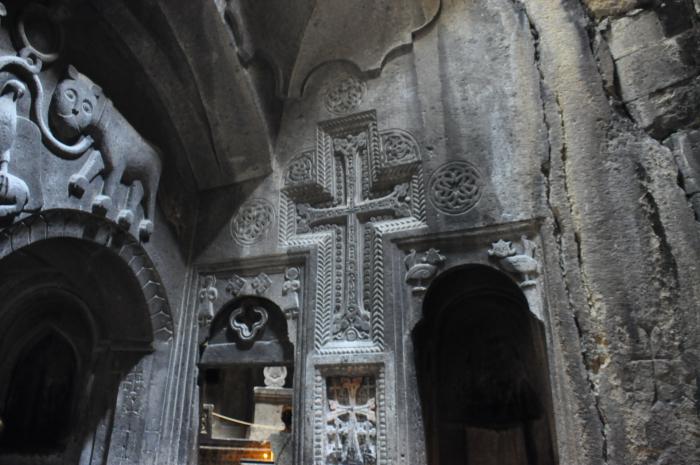 Небольшой – километров десять перегон, и мы попадаем в . Его еще называют «Монастырем Копья» — именно там, до XII века, хранилось копье, которым римский легионер пронзил Иисуса на Кресте. Сейчас это копье находится в Эчмиадзине. Примечателен этот монастырь и тем, что часть его помещений вырублена в скале. Резьба по камню. Такое внутренне убранство есть только в этом монастыре.