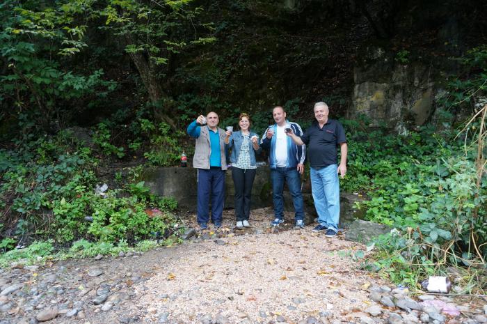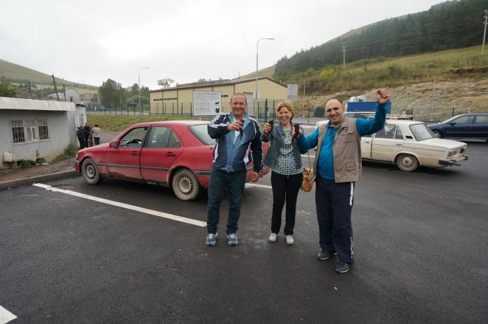 Пока стояли, мимо нас в сторону границы проехало три машины. Из первой — старого, красного мерса, на нас пристально смотрели трое бравых грузинских парней… Что-ж, надо и нам двигаться. За ближайшим поворотом стоял на обочине тот самый мерседес. Ребята махали руками и призывали нас остановиться. В России, скорее всего, проехал-бы мимо, а вот в Грузии остановился… Первый вопрос нам: «Ребята, у вас все в порядке?» «Конечно в порядке» — отвечаем мы. «Ну тогда попробуйте воды из источника» — предлагают ребята. Действительно, слева есть маленький водопадик, вода холодная и вкуснющая. Пока попили и умылись на багажнике мерседеса появилась нехитрая закуска и непременная бутыль, так же выяснилось, что наверху горы есть сельское кладбище, на котором семнадцать лет назад похоронен друг этих ребят, сами они едут в Армению к родне и вот остановились помянуть друга, а нам, безоговорочно, предлагается присоединится к ним. Мне с трудом удается отказаться от стакана крепчайшей чачи, отмазки типа «я за рулем, да и вообще не пью» наталкиваются на полное непонимание, типа «чего тут пить-то»? Выручает жена, которой тут же вручается пол литровый стакан с домашним вином. Мне же достается стакан с минералкой и здоровый кусок лаваша с домашним сыром. Чокнулись, выпили за упокой друга (так принято). Второй тост – за знакомство! Заодно и познакомились – Гарик, Георгий, Роберт из Тбилиси, очень приятно, Саша и Таня из Москвы!