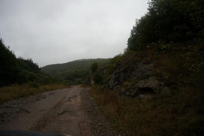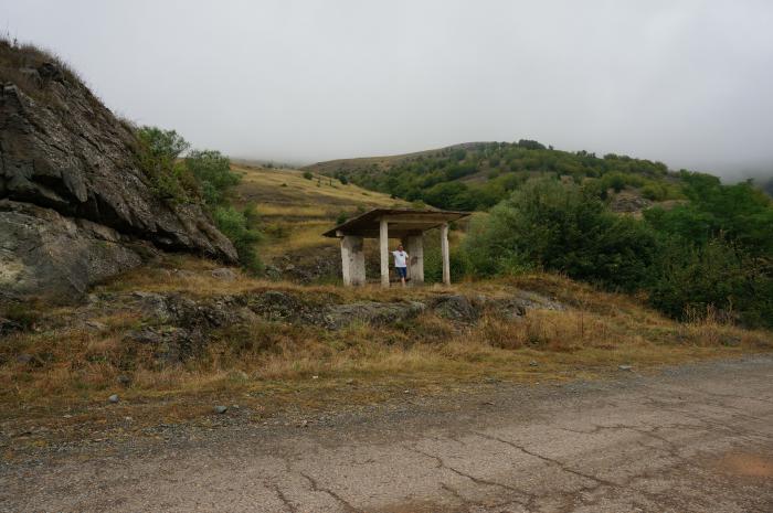 Итак, часиков около десяти утра, 4 сентября тронулись из Тбилиси. Заложив круг почета по старому городу (вот в новых тбилисских развязках и одностороннем движении «Навител» откровенно чудит) выехали на трассу. Машин становится все меньше, с армянскими номерами нет вообще. Нас это слегка насторожило, но дорога вполне приличная, едем дальше. На одной из развилок уходим с основным потоком (если так можно назвать две-три попутные машины) направо, но навигатор сообщает нам, что мы ушли с маршрута. Разворачиваемся, едем назад. Налево от развилки идет свежеотремонтированная дорога, даже работы еще не закончены – рабочие делают ограждение. Останавливаемся и решаем уточнить у работяг – а далеко-ли, собственно, до армянской границы? Правильно едете, сказали работяги, граница уже близко. Ну, раз так, продолжаем движение! По-прежнему, удивляет практически полное отсутствие попутного (да и встречного то же) транспорта, но дорога отличная, виды радуют глаз, начавшийся дождь не смущает. Асфальт, как всегда, кончился внезапно, как раз у древней автобусной остановки и началом небольшого населенного пункта. На остановке, спрятавшись от дождя, сидят два местных жителя. Еще раз решаю уточнить о правильности выбранного пути. Все верно, до границы осталось километров десять. На вопрос о наличии асфальта на дороге получаю жизнеутверждающий ответ: «был». Действительно, был.