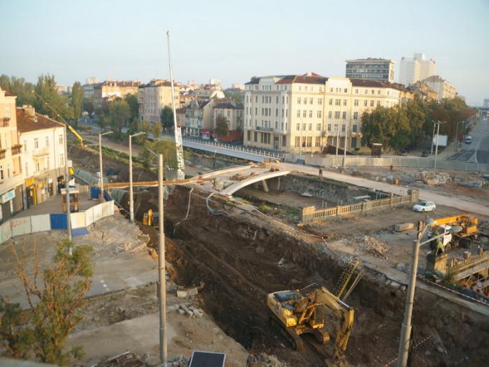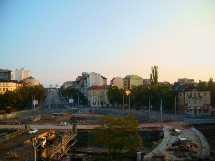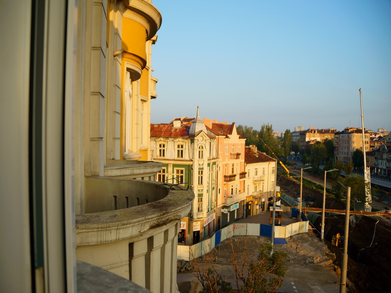В Софии бронировали , расположенный почти на трассе, но в центре. Тут нам не повезло — почти приехав, мы уперлись в забор стройки. С помощью навигатора объехали с другой стороны — опять забор стройки. Иван — штурман дошел до отеля и выяснил, что метро строят и заборы с 4 -х сторон отеля — парковки нет. Пришлось оставить машину на параллельной улице, благо, место нашлось. Переночевали хорошо, несмотря на то, что техника на стройке работала всю ночь. Пришлось плотно закрыть все окна и включить кондиционер. Завтрак был вполне ничего себе. Вот что мы увидели утром из окна: