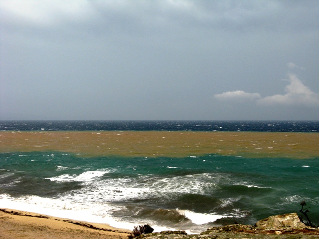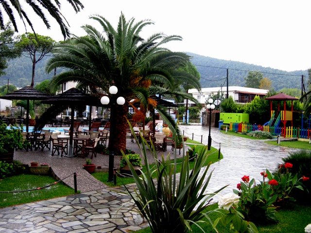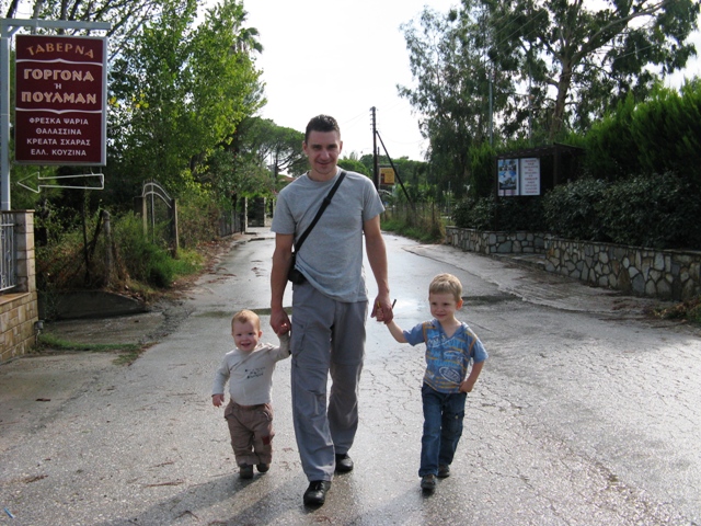 Всю ночь бушевала гроза с громом, молнией и сильным ливнем. Утром дождь немного стих и мы вышли из номера позавтракать и осмотреться. Территория отеля небольшая, но очень ухоженная и красивая, пройдя 20 метров через красивый сад, попадаем на небольшой пляж с соснами. Мы немного погуляли вдоль моря, которое было очень теплым, но снова начавшийся дождь опять загнал нас в номер. Как только погода опять немного улучшилась, мы сели в машину и поехали осматривать побережье. Погода совершенно не располагала к прогулкам и, доехав до ближайшего городка, мы зашли в супермаркет, купили детям игрушек и разных вкусностей. Вернувшись обратно в Ворвороу, мы зашли в таверну на берегу и пообедали. К вечеру погода стала налаживаться и у нас появилась надежда, что нам еще удастся здесь покупаться и позагорать.
