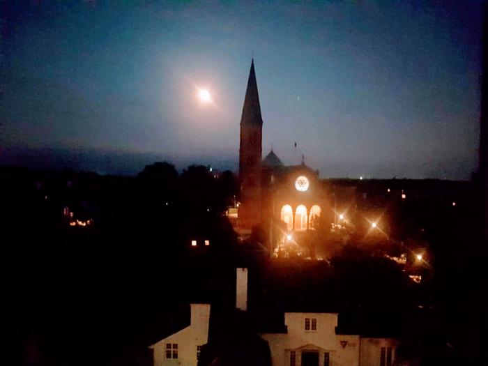 На улице, без сомнения, свободнее всего чувствовали себя велосипедисты. Огромное количество всевозможных форм и расцветок, с боксами для вещей спереди и колясками для детей сзади, корзинами для продуктов и прицепами, они безраздельно властвовали на дороге. Для них здесь и отдельные дорожки, и свои светофоры, и все привилегии. Передвигаясь на машине по городу, я все время опасался, как бы кого на повороте не зацепить. Ну а тем временем солнце свалилось, таки за горизонт и собор в обрамлении красивой подсветки величественно возвышался на другой стороне улицы.