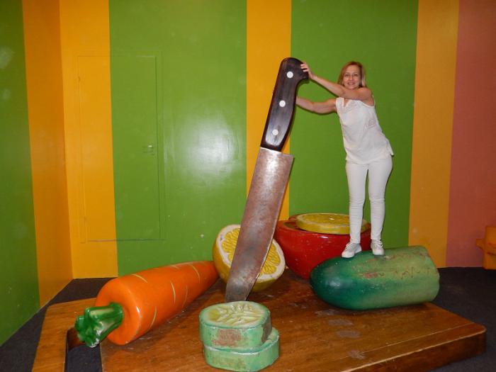 Потом сын уговорил меня пойти с ним в комнату страха и комнату Великана, что находится на территории ВДНХ в 55 павильоне. В комнате страха снимать нельзя, да и не получилось бы — темно. Пока мы шли по темному лабиринту сквозь цепи и «улюлюканье» мертвецов, я по-моему кому-то даже руки ушибла, которые хватали нас из-за разных углов, а я отбивалась от них как могла.