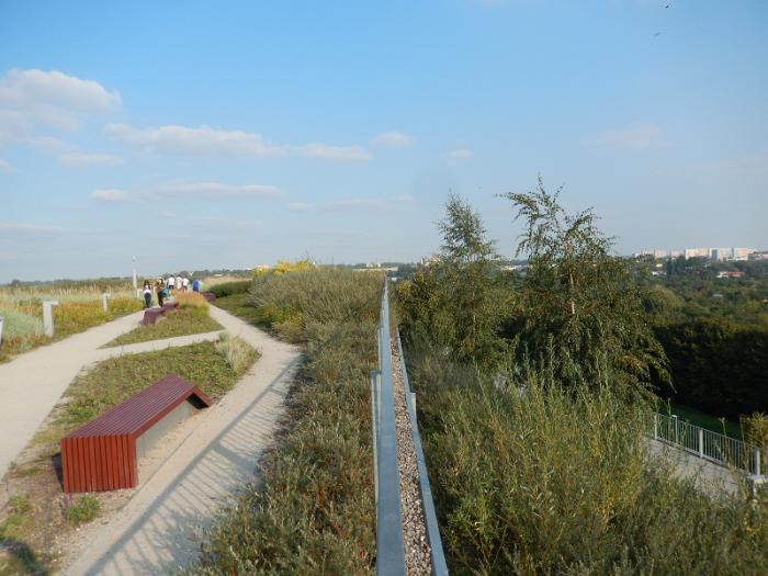 Довольно интересное использование крыши. Здесь и детская площадка с песочком, по которому дети ходят босиком и шезлонги для присматривающих за детьми родителей, есть интересное молодежное арт-кафе. А чуть выше разбиты палисадники и выложены дорожки для прогулок.