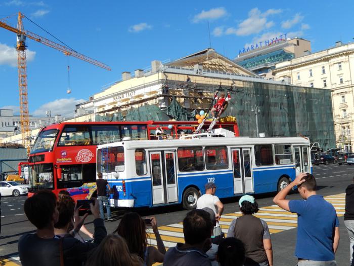 Прогуливаясь, заметили подготовку к съемкам. Подождали немного и засняли как актёр (или скорее каскадёр) перелетал на рогах троллейбуса на туристический автобус…