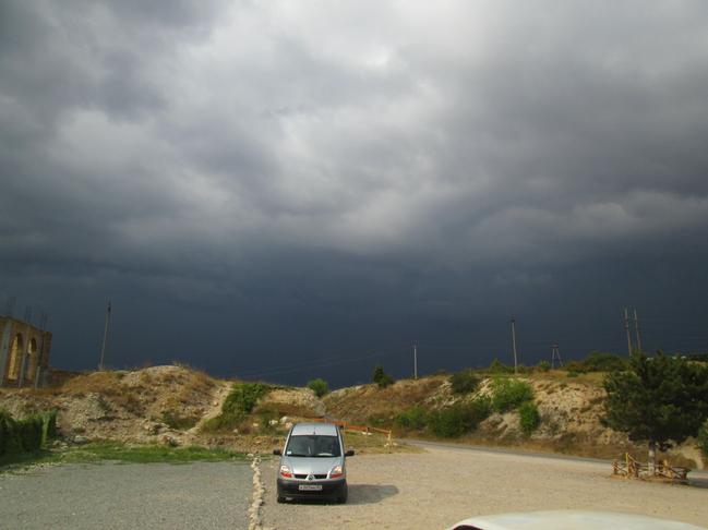 Но рано мы расслабились, на нас стремительно надвигался грозовой фронт из Бахчисарая, который чуть ранее чуть не утопил нас. Пришлось бросать наслаждаться панорамными видами, прыгать в машину и, поддав газу, мчаться дальше, на юг Крыма.