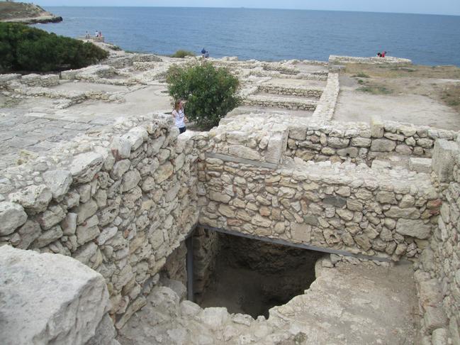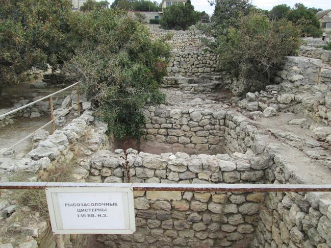 Херсонес славился своим рыбным соусом, для изготовления которого в городе в 1-6 веках н.э. строили рыбозасолочные цистерны, достигавшие порой невиданных размеров. Рыбаки в больших объёмах ловили мелкую рыбёшку, складировали её на дно цистерн, посыпали сверху солью, специями, и оставляли до тех пор, пока рыба в результате естественного разложения не превращалась в однородную полужидкую массу. Запах был весьма специфическим, современных людей вывернуло бы наизнанку от такого соуса, но… Он был очень популярен в то время, и в больших объёмах шёл на экспорт. Вот в таких цистернах такой соус изготавливался и хранился: