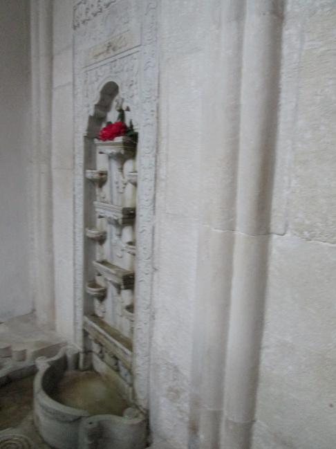 — именно этому фонтану, Фонтану слёз, посвятил свои строки Пушкин. Он был построен иранским художником и скульптором Опером по распоряжению крымского хана Кырым-Гирея у мавзолея любимой наложницы — Диляре, погибшей в 1764 году. Хану хотелось увековечить в фонтане лицо любимой, но по мусульманским обычаям это запрещено, поэтому лицо Диляры пришлось изображать в виде цветка лотоса из пяти лепестков.