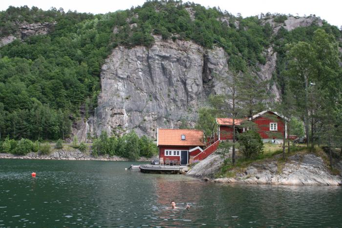 На последний день в Норвегии оставался короткий, порядка 300 км, путь до Кристиансанн, где в 16.00 нас ждал паром до датского Хиртсхальса. Дорога также была живописная, и самое приятное воспоминание оставила долгая остановка около деревушки Fidje в 30 км от Кристиансанн, где мы насобирали земляники и покупались в живописном месте, и вода была теплейшая. Кстати, уже после путешествия мониторили погоду в Норвегии, и, если в районе Лофтуса всё были дожди и дождички, то в Кристиансанне только солнышко. И если бы я заново поехал в Норвегию, то на Fidje часа 4 запланировал бы обязательно.