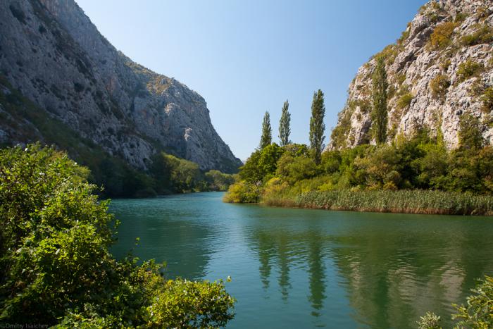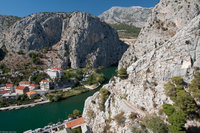 Дорога заняла минут 20. Остановились около ближайшего пляжа. В отличие от Сплита и большинства пляжей в Хорватии, пляж в Омише песчаный, да еще и мелкий. Как следствие — огромное количество народа с детьми. Вообще, в Омише чувствуется курортная атмосфера. Городок хоть и небольшой, но многолюдный. Мы искупались, позагорали и поехали осматривать окрестности. Доверившись интуиции, поехали вдоль по дороге, которая пролегает вдоль реки, впадающей в море. Вода в ней нереального цвета.