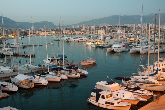После такого насыщенного дня нужно было хорошо поужинать. Так как рыбы мы не поймали, надо было ей отомстить — выбрали рыбный ресторан Jugo (у нас в номере был небольшой путеводитель, а в нем рейтинг ресторанов, и Jugo занимал там одну из верхних строк). Просто гуляя по Сплиту, очень маловероятно, что мы бы заглянули в это место, потому что находится оно в стороне от туристических троп — в зоне причала для частных яхт. Даже зная адрес, пришлось немного поискать.