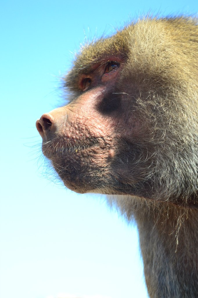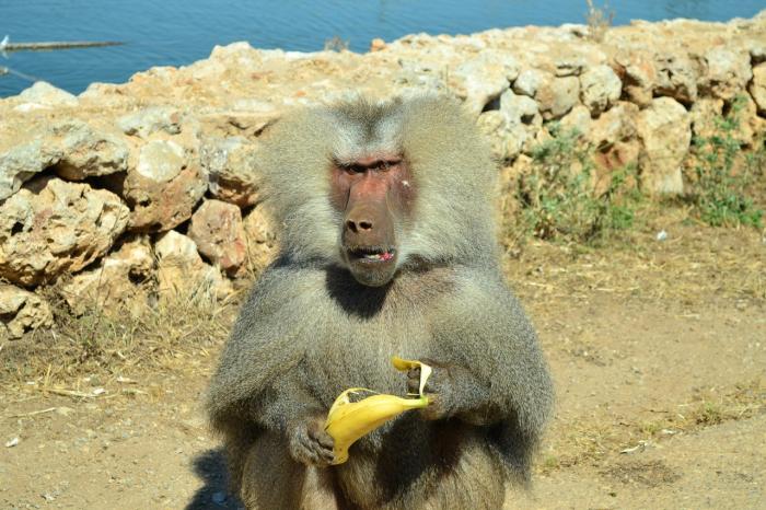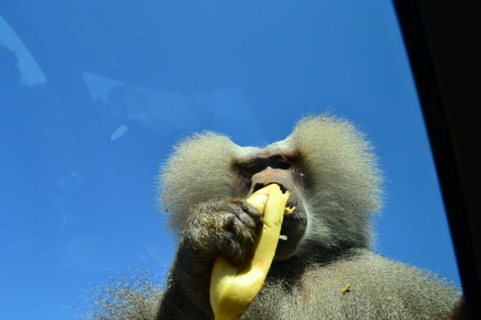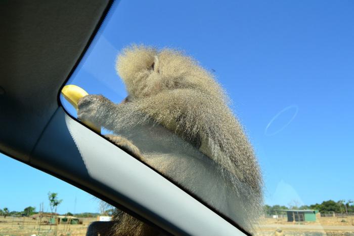 Когда подъехали к обезьянам, то те вели себя тихо, но стоило кинуть один банан… что тут началось… На наш «пыжик» залезло около 5 обезьян, а самый главный уселся на боковое зеркало со стороны водителя. Оно трещало и жалобно скрипело… Обезьяны перемещались по крыше всей машины, грохот стоял неимоверный, я уже подумал о том, что крышу нам промяли… Бананы мы выдавали через маленькую щель в чуть приоткрытом окне, так как хорошо знали, что обезьяны достаточно агрессивны и опасны. Выделялся глава прайда, он съел 90% бананов, оставляя своим соплеменникам только шкурки. Вот он, «главнюк», который после того как у нас закончились бананы, сел на лобовое стекло и справил малую нужду прямо на машину (после чего нам пришлось ехать в автомойку).