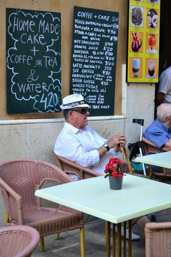 Из ресторанов были только в VINICIUS, брали сначала паэлью, потом пиццу. Чек на троих получился около 60 евро (паэлья на троих+литр сангрии+0,5 пива+сок), в кафе по разному, в среднем около 30-35 евро на троих. Стоимость кофе видно на фото, где в Алькудии.