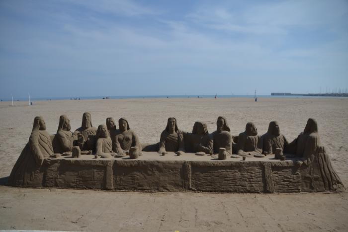 Знаменитый пляж валенсийского побережья встретил нас песчаной многофигурной композицией, изображающей «Тайную вечерю». Да, скульптор тоже знаком с идеями Дена Брауна, хотя после старинного гобелена в Сан-Ильдефонсо это уже не удивляет: